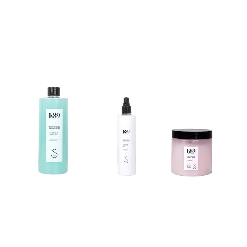 Kit K89 Curl Gel para Cabello Rizado, con champú Low Poo, Curl Cream y Curl Gel Professional Curly Hair. Hidrata, define y controla el encrespamiento, dejando los rizos elásticos, brillantes y con movimiento.