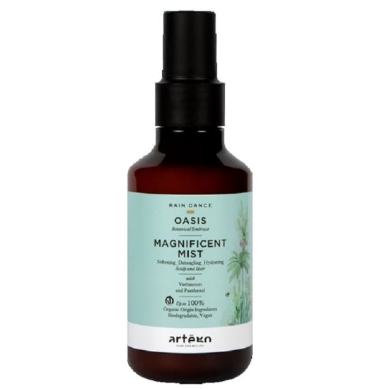 Magnificient Mist Artego Rain Dance Oasis es un tratamiento acondicionador en spray sin aclarado, de acción hidratante, desenredante y protectora, que añade cuerpo, elasticidad y brillo a la fibra capilar, mejorando al instante el aspecto y la manejabilidad del cabello.