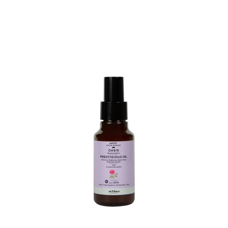 Rain Dance Oasis Prestigious Oil de artègo es un aceite de belleza multiusos para cabello y piel, formulado para regenerar, iluminar e hidratar en profundidad sin aportar peso ni dejar sensación grasa.